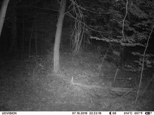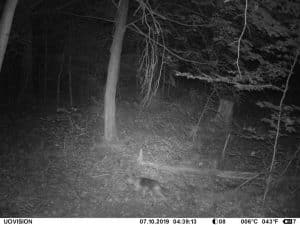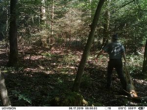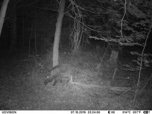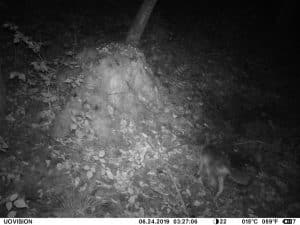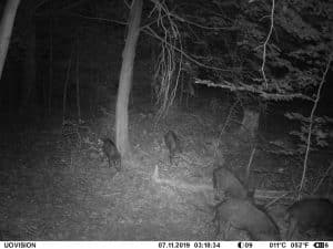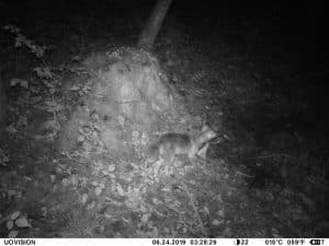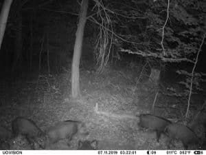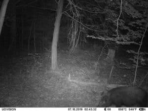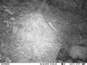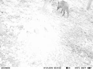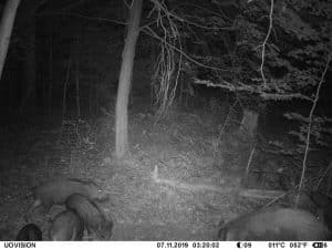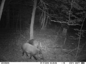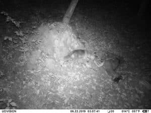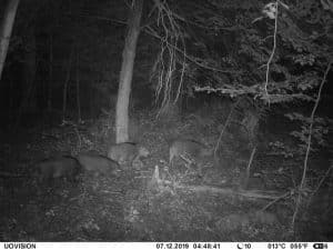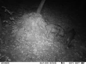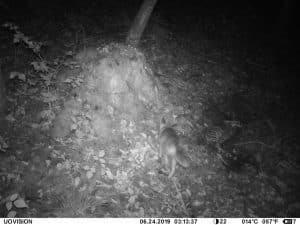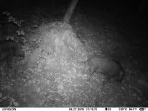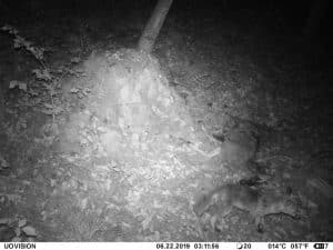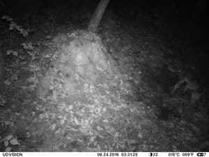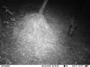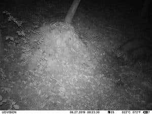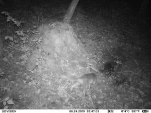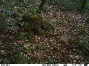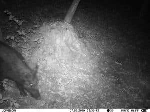Am 17. Juni 2019 habe ich ein Unfall-Reh an eine entlegene Stelle im Wald verbracht und an einer Kamera platziert. Diese hat über einen Zeitraum von exakt 4 Wochen 493 Bilder gemacht. Am 2. Juli waren vom Reh nur noch Haarreste zu finden, nachdem sich zuvor vor allem Fuchs und Sauen und natürlich Insekten – man sieht am 22.6. den total mit Fliegenmaden übersäten Kadaver – bedient hatten. Am 2. Juli hat eine Sau den „Kamerabaum“ dermassen malträtiert, dass die Kamera nach unten abgeknickt ist. Am 3. Juli habe ich die Kamera wieder eingerichtet, allerdings mit etwas anderem Blickwinkel auf die Stelle. Interessant erscheint mir in diesem Zusammenhang, dass auch nach dem völligen Verschwinden des Kadavers ab dem 2. Juli bis zum Abhängen der Kamera am 17. Juli noch fast jede Nacht Fuchs und vor allem Sauen an der Stelle eingefunden haben. Dies ist um so bemerkenswerter, als dass hier kein Sauenwechsel verläuft. Ich hatte die Kamera hier seit Mai 2019 hängen und in diesem Zeitraum ausschliesslich Rehwild fotografiert. Anscheinend hat der Kadaver die Sauen hergezogen und noch weit über den „Nutzungszeitraum“ hergelockt. Dafür ist seit dem Ausbringen des Kadavers kein einziges Stück Rehwild mehr dort gezogen.