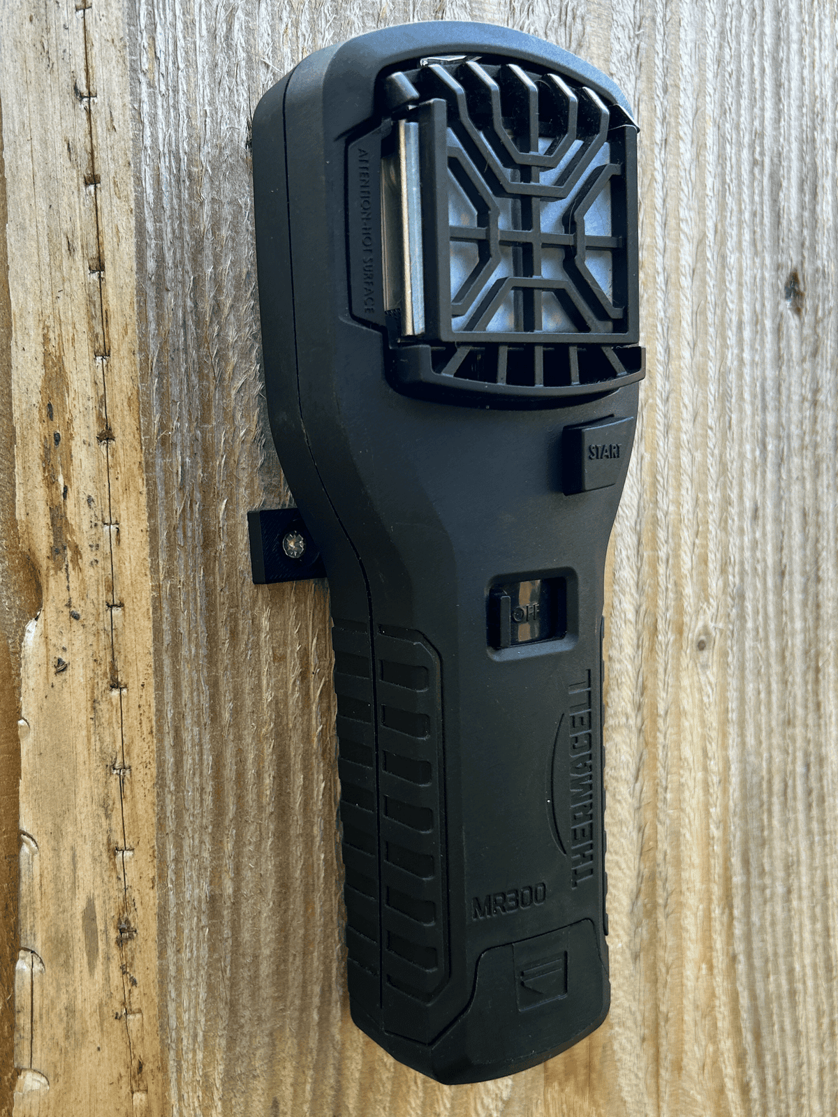 Das Thermacell MR300 kann man entweder am Gürtel tragen oder hinstellen oder -legen. Richtig komfortabel lässt es sich in der Kanzel mit einer Halterung positionieren.